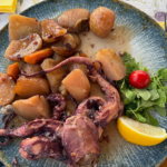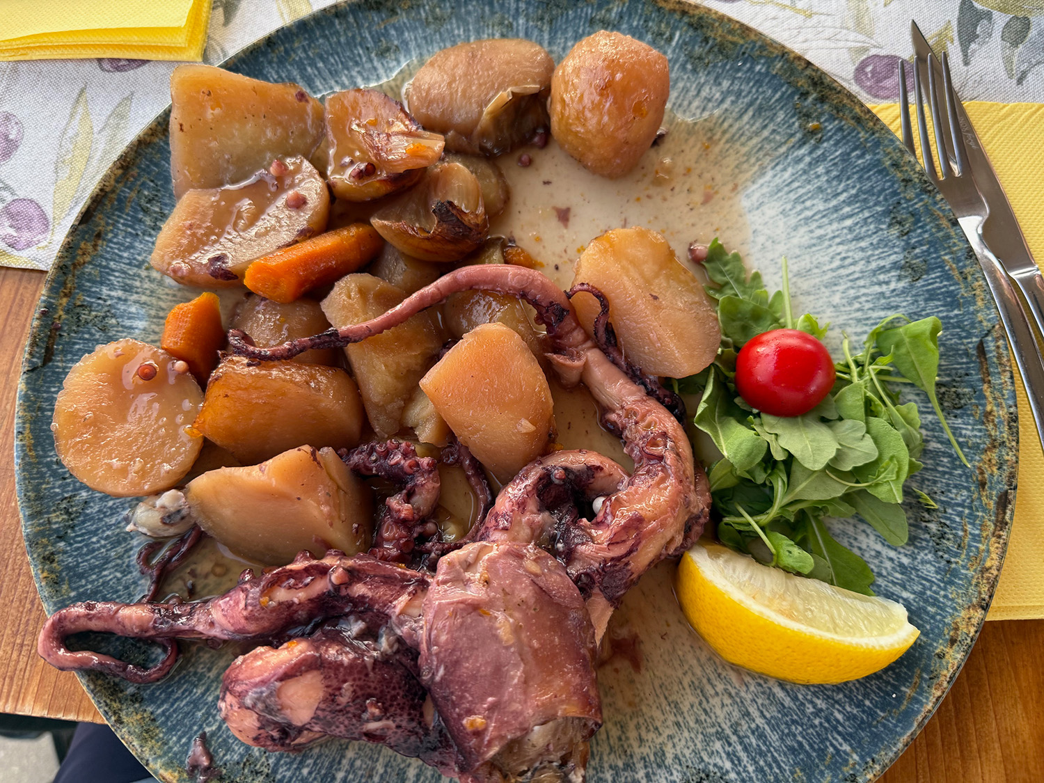 - Wir rudern an der Küste entlang Richtung Pakoštane/Drage. Plötzlich ruft die Steuerfrau: „Delfine, Ruder halt“ und wir erfreuen uns an den Sprüngen der 2 Delfine. Wir fuhren zum Campingplatz Prosika und machten dort Halt für einen kurzen Reparaturstopp an einer Manschette. Durch den aufkommenden Maestral wurden die Wellen höher und wir fuhren zurück. Eigentlich wollten wir noch einen Abstecher in eine Beach Bar machen, aber es war wieder nicht möglich anzulanden (Abgrenzung Badebereich). Am Spätnachmittag gönnten wir uns in Pirovac einen Aperitif in der Beach Bar Mare Blue. Abendessen war heute in einem Restaurant direkt am Meer. Dort gab es die kroatische Spezialität Peka – langsam unter einer Glocke gegarter Oktopus. Wir bummelten durch den Ort, wo das Olivenfest mit Marktständen und Musik stattfand.
