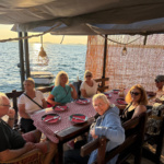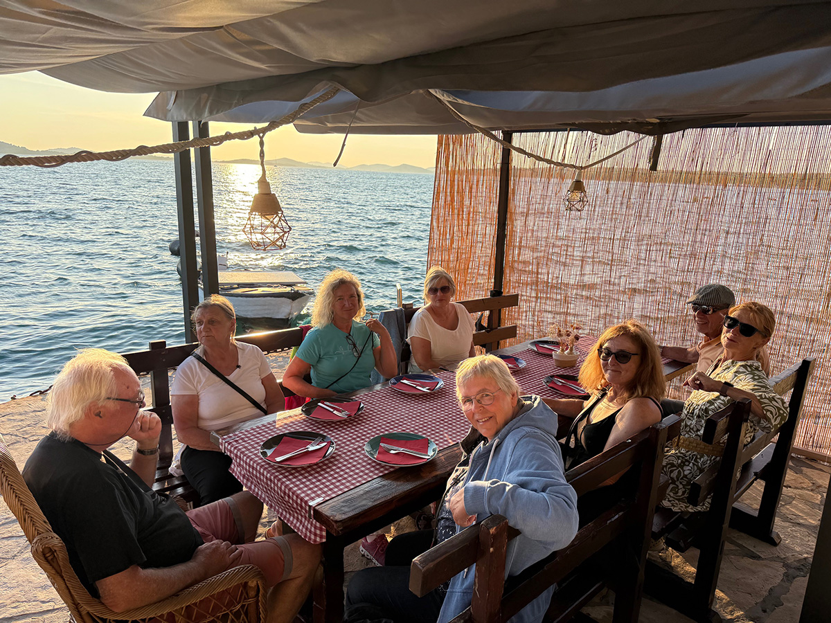 - Frühmorgens ging es im Bus los nach Biograd na muro. Dort wartete Kapitän Damir mit dem von uns gecharterten Boot „Cotonum“ auf usn. Als Auftakt bekamen wir sogleich einen Begrüßungsschnaps und Kaffee. Er tuckerte mit uns durch das Kornaten-Archipel in den Naturpark Telašćica. Wir freuten uns über mehrere Badestopps im türkisfarbenen, glasklaren Wasser. Einmal gab es sogar von uns Frauen eine Wasserballet-Einlage. Wir wurden super mit einer Vorspeise, Pasta und einem Dessert kulinarisch verwöhnt. Unterwegs wurden wir von einer Delfinfamilie unter und neben dem Boot von 6–7 Tieren begleitet. Auf der Rückfahrt kehrten wir in Pakoštane in die Café Bar Dupin ein und begrüßten Martina und Marin an der schön gelegenen Badebucht zum Eis essen. Den Abend ließen wir auf der Pensionsterrasse ausklingen.